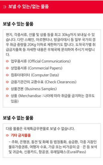 보낼수 있는 물품 편지, 각종서류, 선물 및 상품 등을 최고 30kg까지 보내실 수 있습니다. 다만 스페인, 아르헨티나, 방글라데시 등 일부 국가의 경우 취급 중량을 20Kg 이하로 제한하기도 합니다.